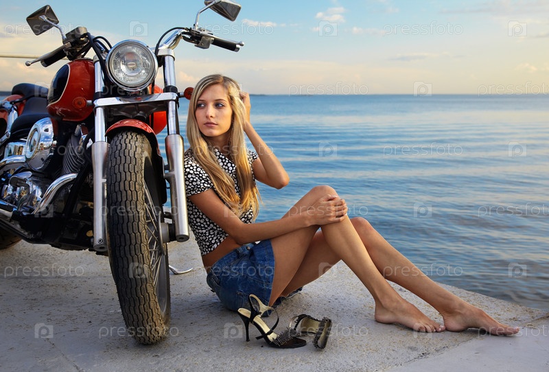 Молодая девушка позирует с красным мотоциклом на набережной