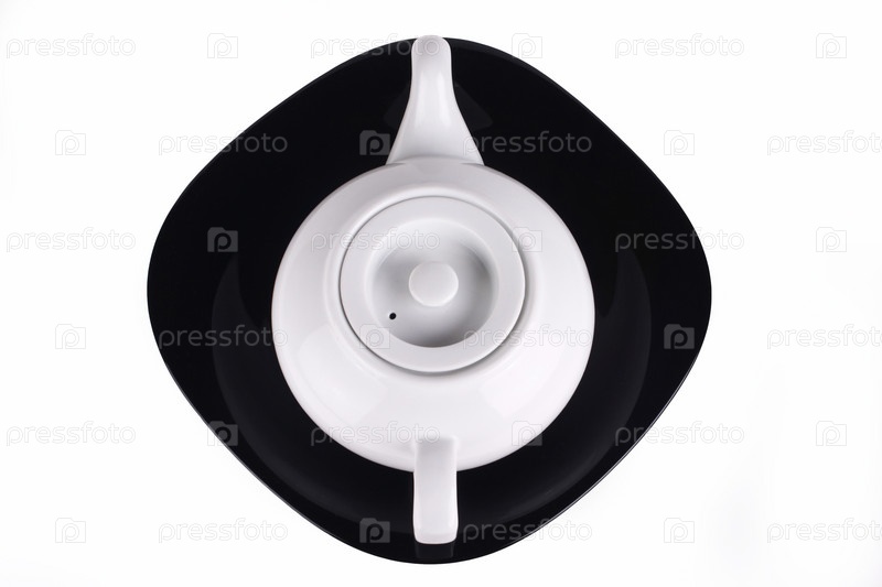 Белый керамический чайник на черной тарелке