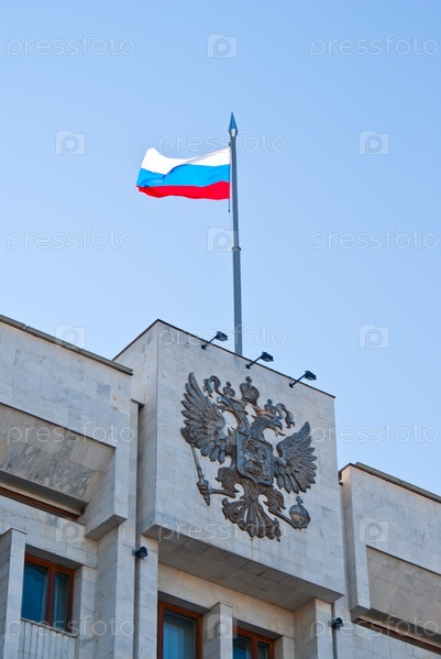 Российский флаг и герб на здании