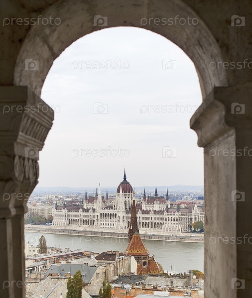 Вид на парламент через арку Рыбацкого бастиона в Будапеште