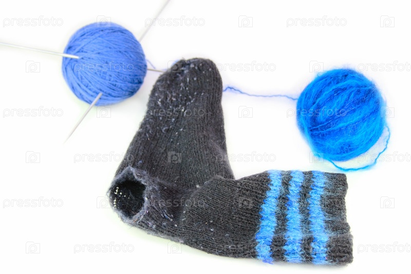 Дырявый шерстяной носок и два клубка ниток со спицами