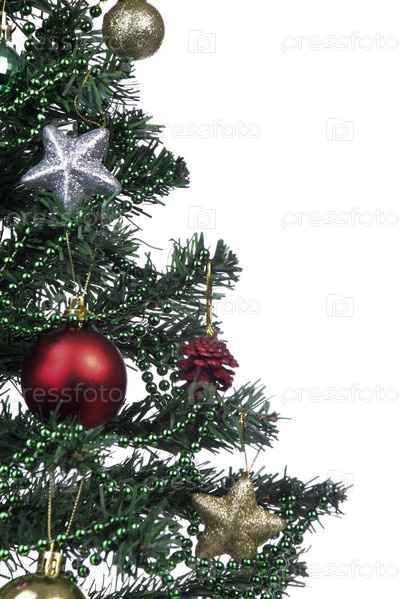 Украшенная рождественская елка на белом фоне крупным планом