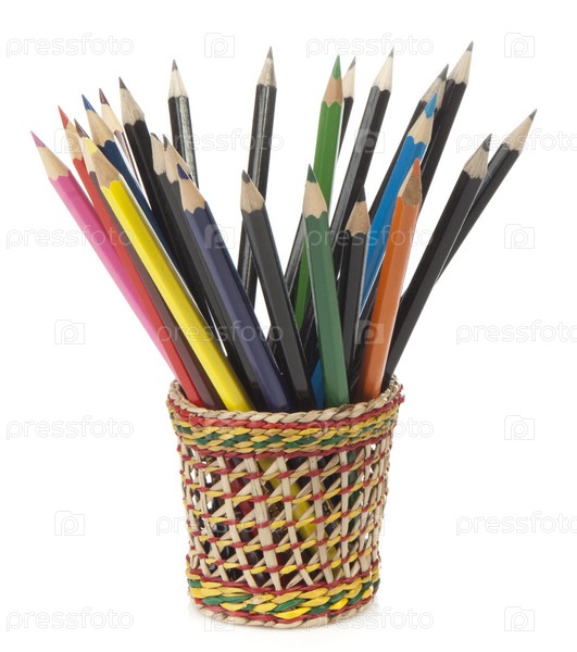 Набор карандашей в плетеной корзинке на белом фоне