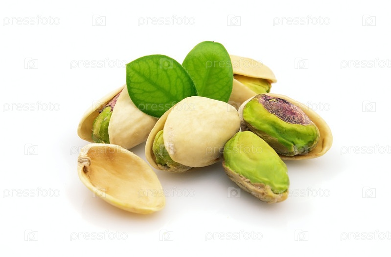 Фисташки с листьями на белом фоне