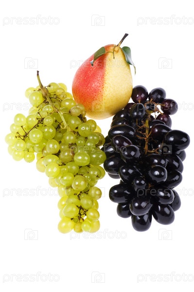 Грозди зеленого и черного винограда со спелой грушей на белом фоне
