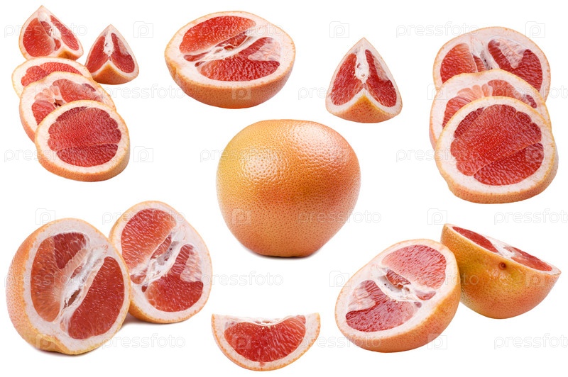 Разрезанный и целый грейпфрут на белом фоне