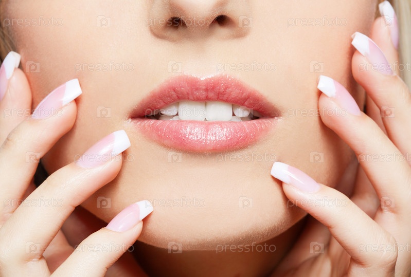 Нижняя часть женского лица и ухоженные пальцы с маникюром