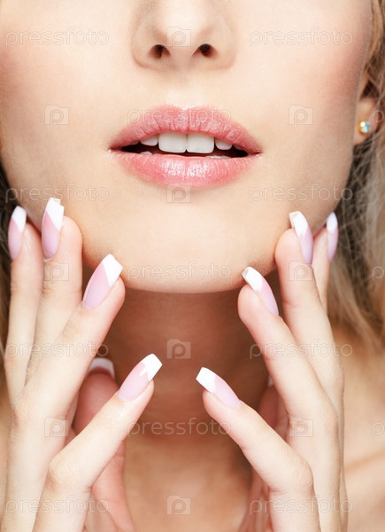 Нижняя часть женского лица и ухоженные пальцы с маникюром