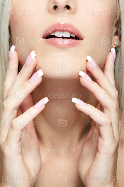 Нижняя часть женского лица и ухоженные пальцы с маникюром