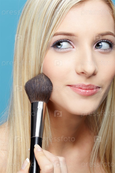 Молодая девушка красится кисточкой для румян