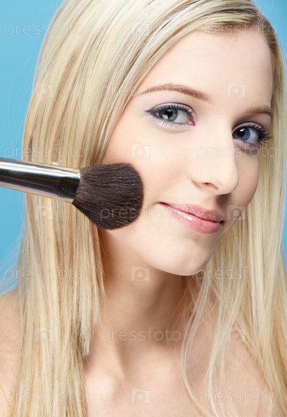 Молодая девушка красится кисточкой для румян