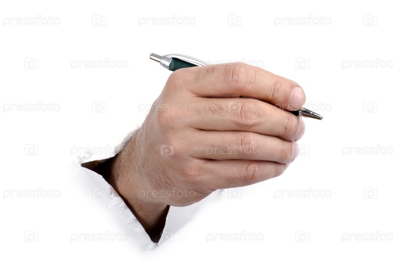 Ручка в мужской руке на белом фоне