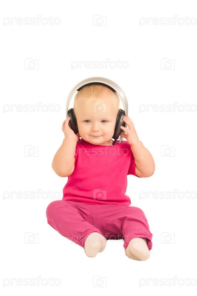 Маленький ребенок слушает музыку в наушниках