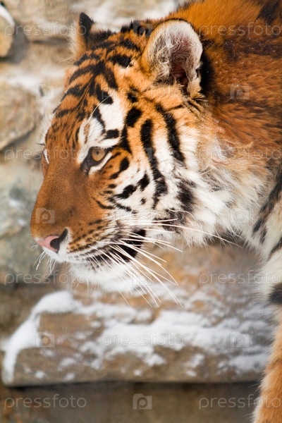Сибирский тигр гуляет в зоопарке.Зимнее время