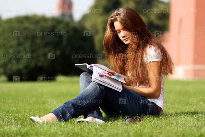 Девушка, сидящая на траве, читает журнал
