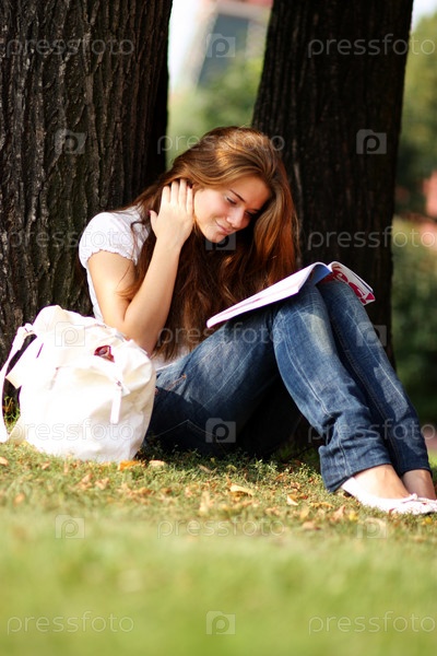 Девушка, сидящая на траве, читает журнал