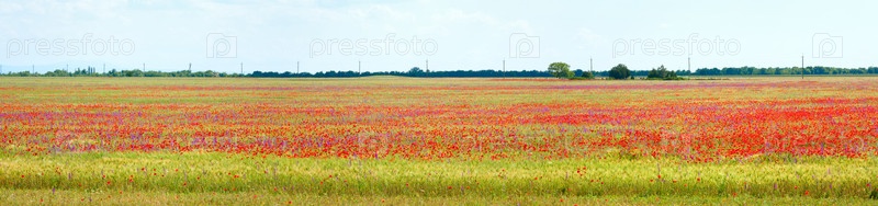 Поле фиолетовых цветов и цветов красного мака