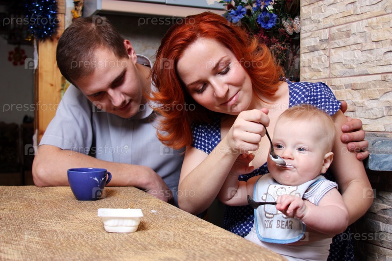 Молодые родители кормят своего ребенка