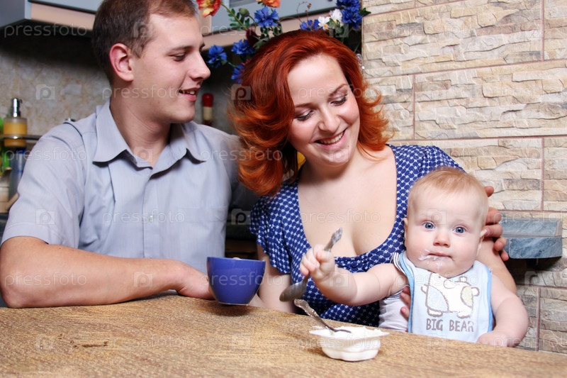 Молодые родители кормят своего ребенка