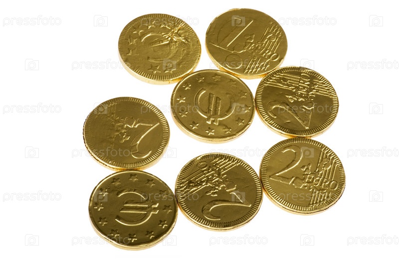 Шоколадные конфеты в форме монет на белом фоне