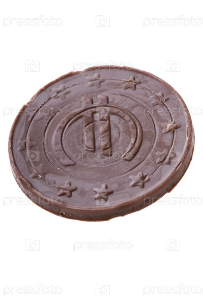 Шоколадная конфетка в форме монетки на белом фоне
