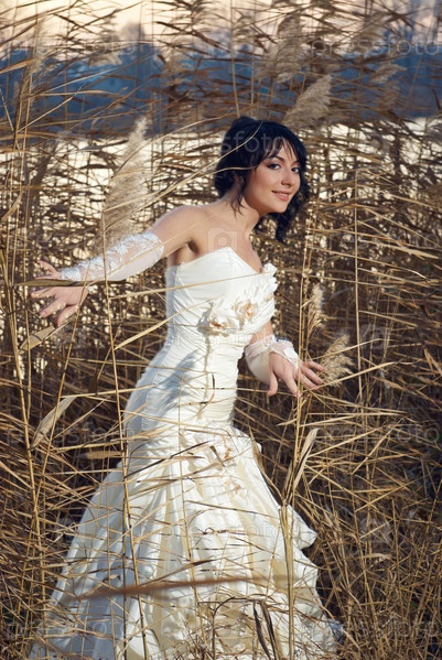 Невеста в свадебном платье стоит в высокой траве на берегу озера