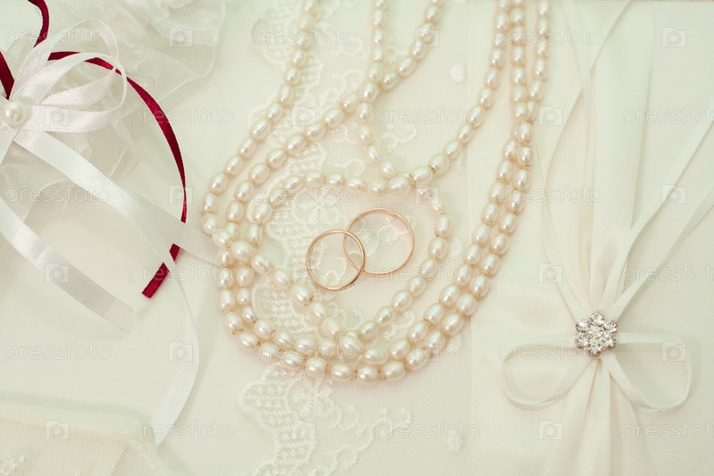 Два обручальных кольца и жемчуг на свадебном платье