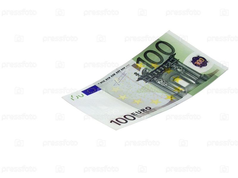 Банкнота 100 евро на наклонной поверхности, изолированной на белом фоне