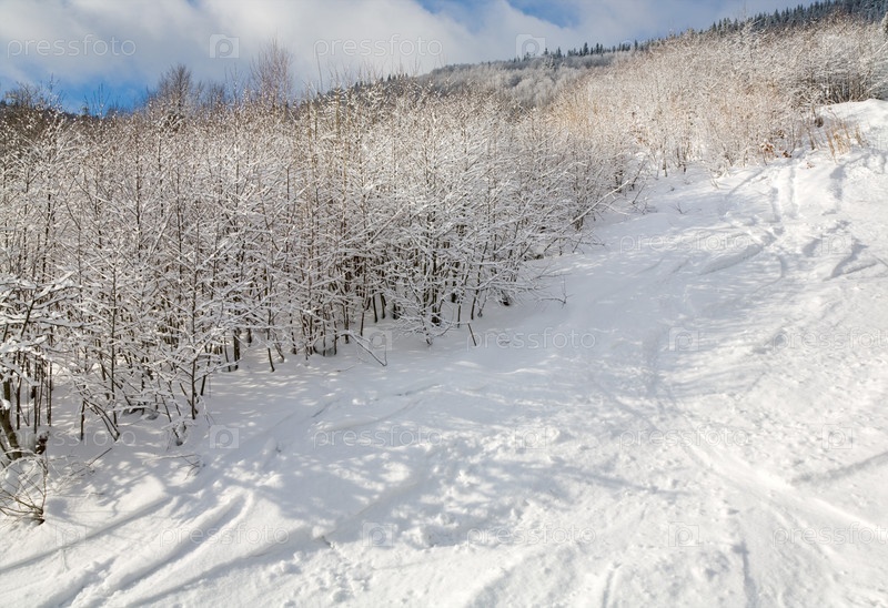 Зимний горный пейзаж с заснеженными деревьями