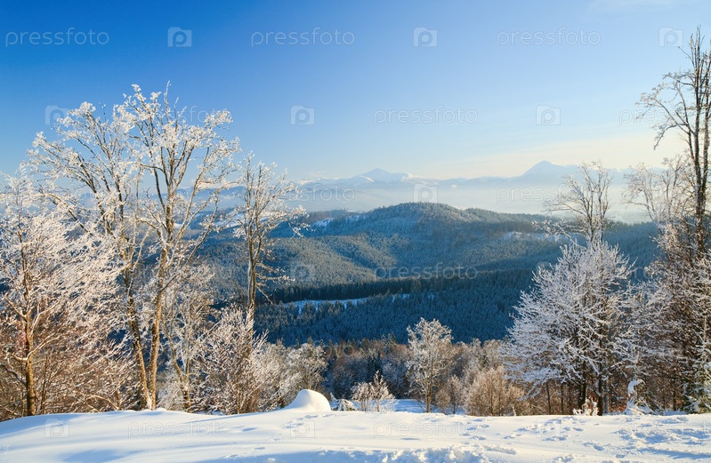 Зимний горный пейзаж с заснеженными деревьями