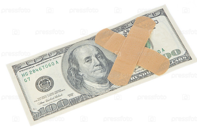 100 долларов и медицинский гипс на белом фоне - символ больной мировой экономики