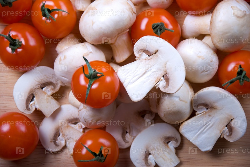 Свежие шампиньоны и помидоры черри