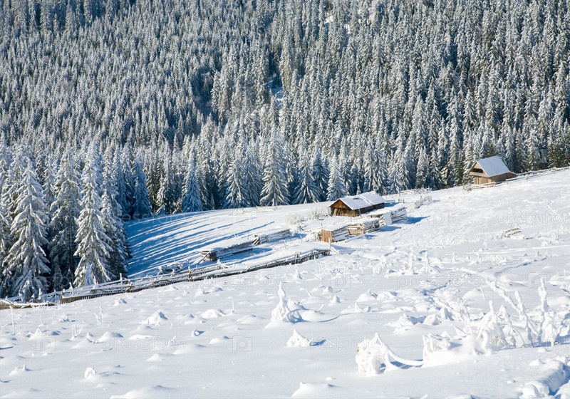 Зимний пейзаж - несколько сараев рядом с лесом