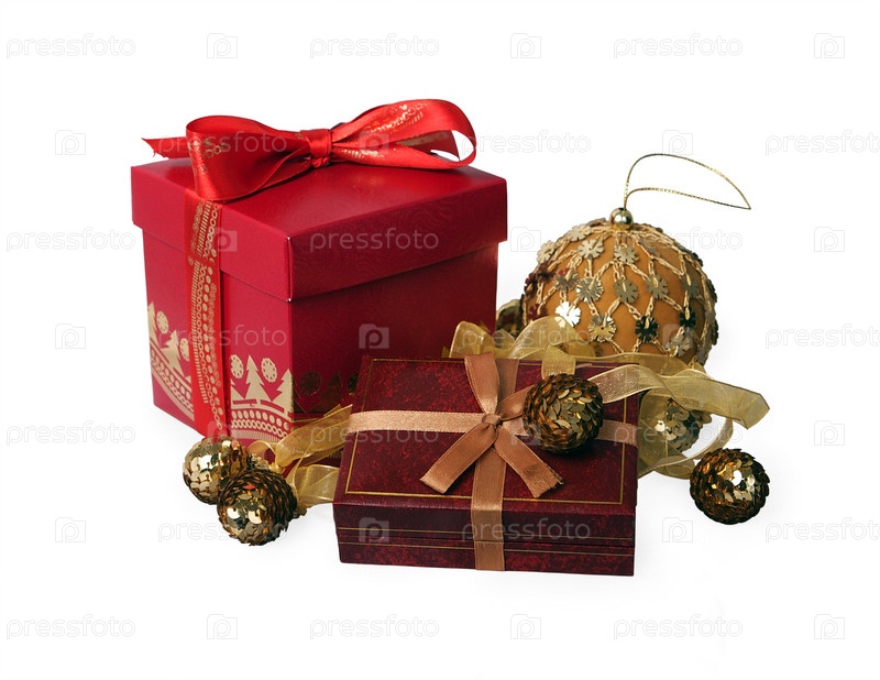 Подарки и новогодние украшения на белом фоне