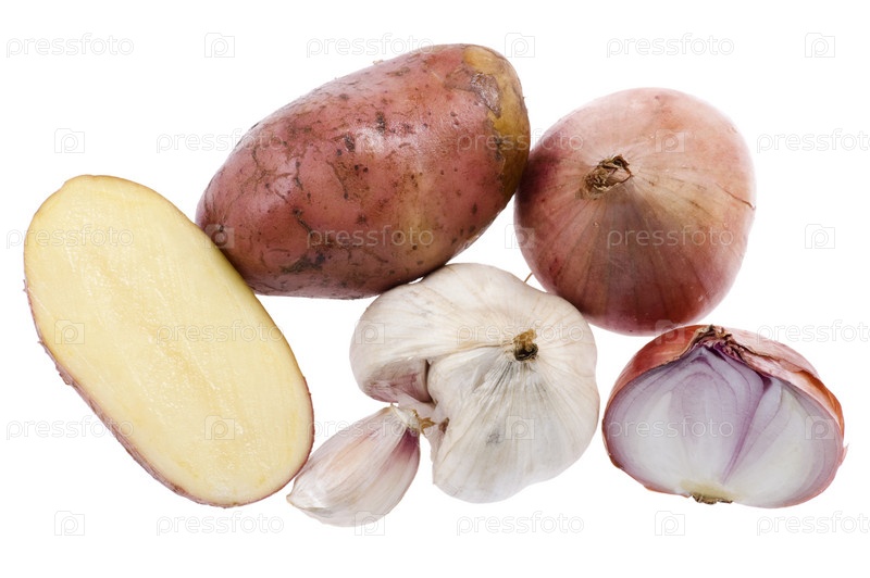 Картофель, чеснок и лук на белом фоне