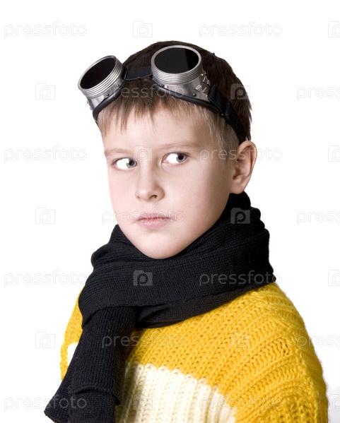 Маленький мальчик в темных очках притворяется пилотом, смотрящим на камеру