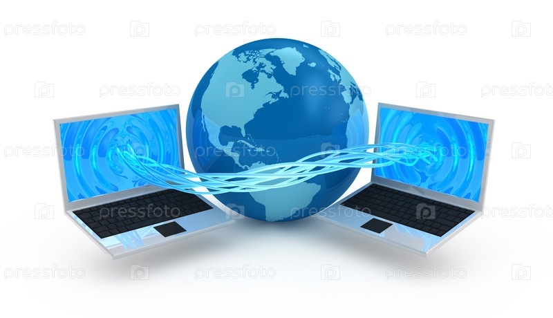 Интернет: два ноутбука и земной шар между ними на белом фоне