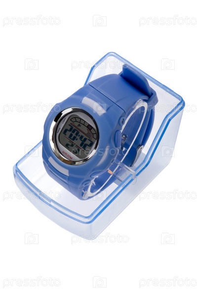 Голубые электронные часы на подставке на белом фоне
