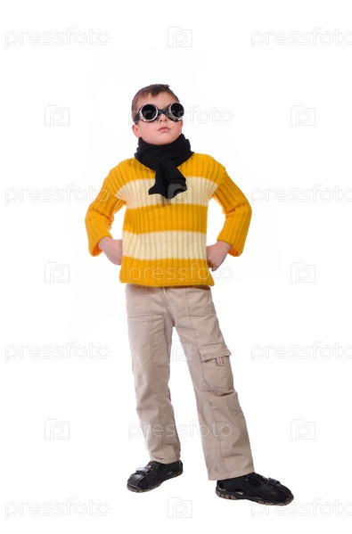 Мальчик в желтом свитере и очках пилота на белом фоне