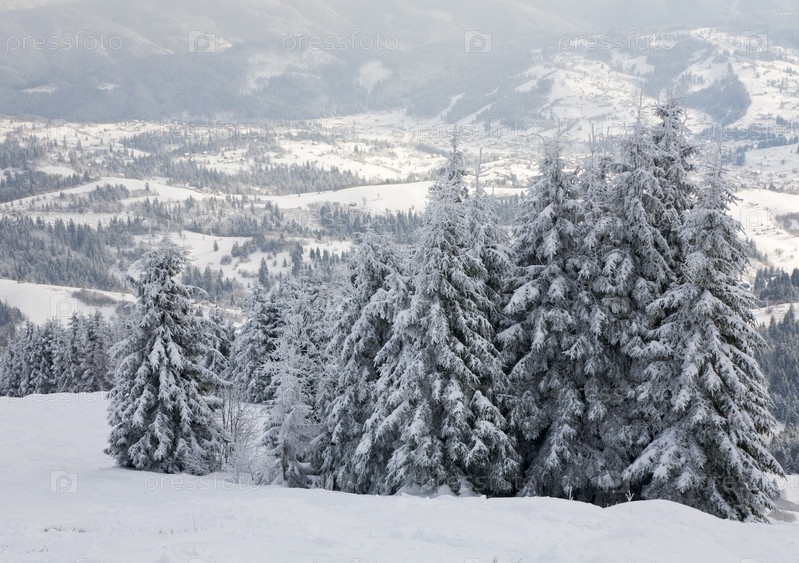 Зимний горный пейзаж с заснеженными елями