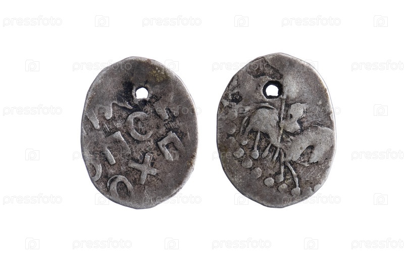 Древние монеты России крупным планом на белом фоне