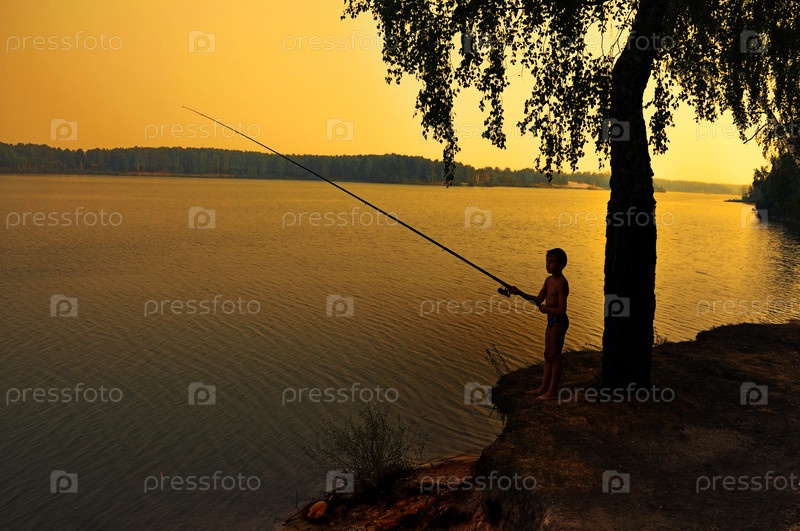 Мальчик рыбачит на берегу реки во время заката