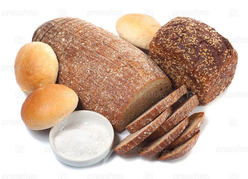 Хлеб из цельной пшеницы, ломтики хлеба, булочки и белое блюдце на белом фоне