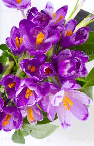Букет фиолетовых крокусов на белом фоне