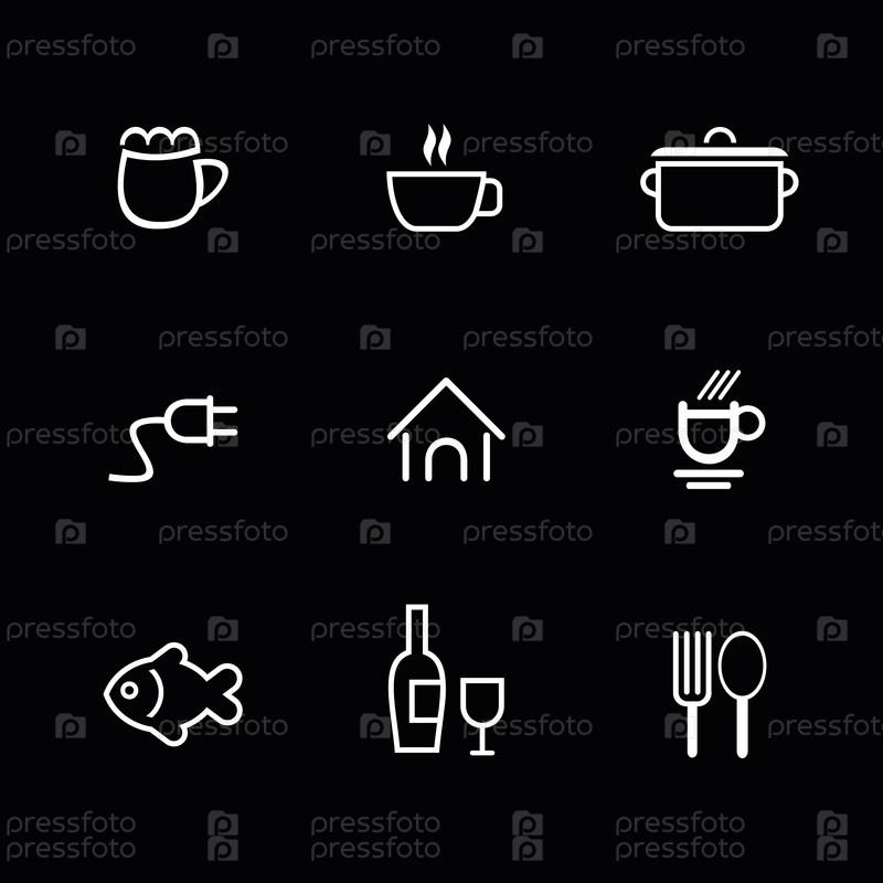 Набор векторных икон для ресторана, бара, кафе и т. Д. Белое изображение (очертание) на черном фоне