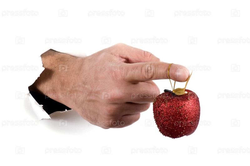 Рука с елочной игрушкой в бумажном отверстии