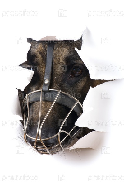 Овчарка в наморднике выглядывает через отверстие в бумаге