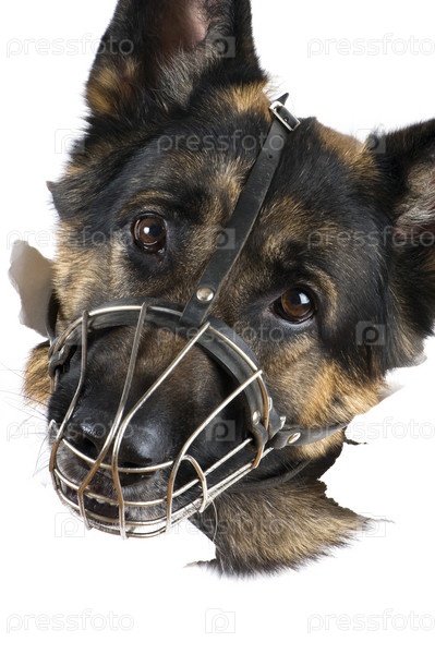 Овчарка в наморднике выглядывает через отверстие в бумаге