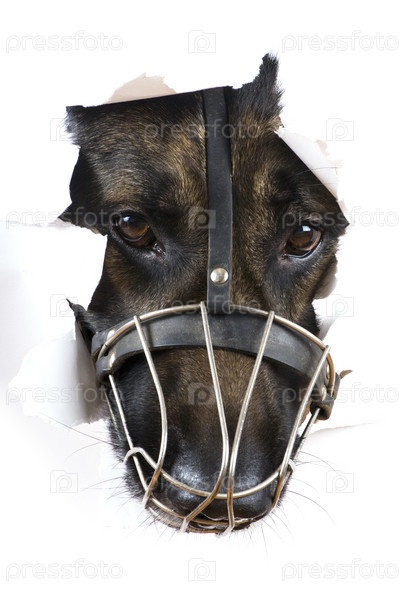 Овчарка в наморднике выглядывает через отверстие в бумаге