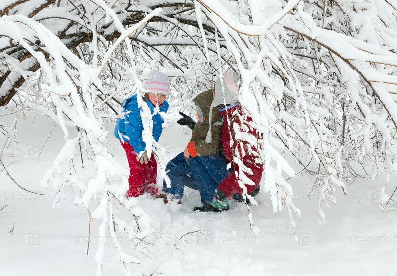 Женщина и двое детей сидят под деревом в снегу